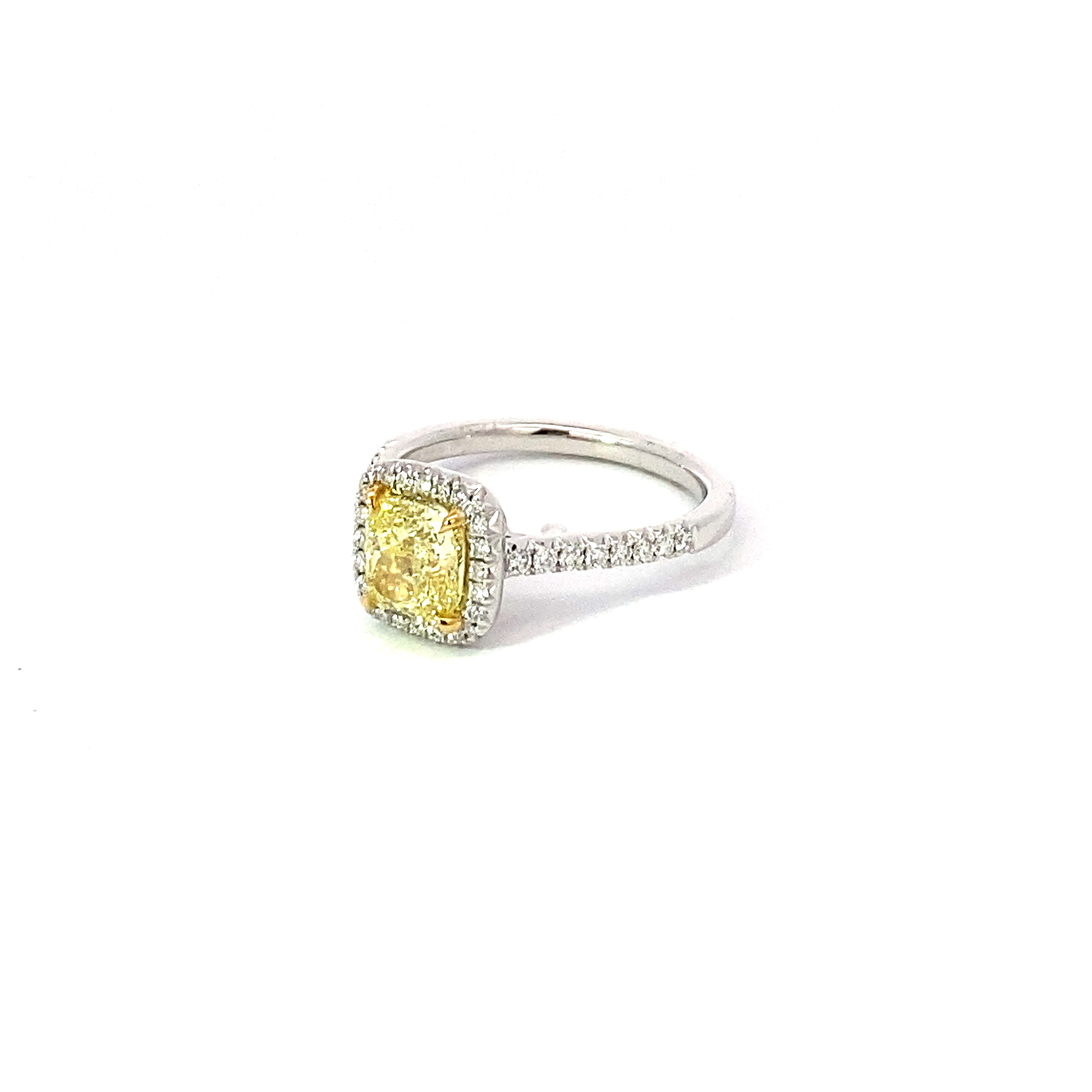 Showcasing a vibrant yellow diamond framed by shimmering white diamonds, this elegant ring exudes luxury and style. The finely crafted band adds to its allure, making it a perfect accessory for any formal event or as a symbol of everlasting love.