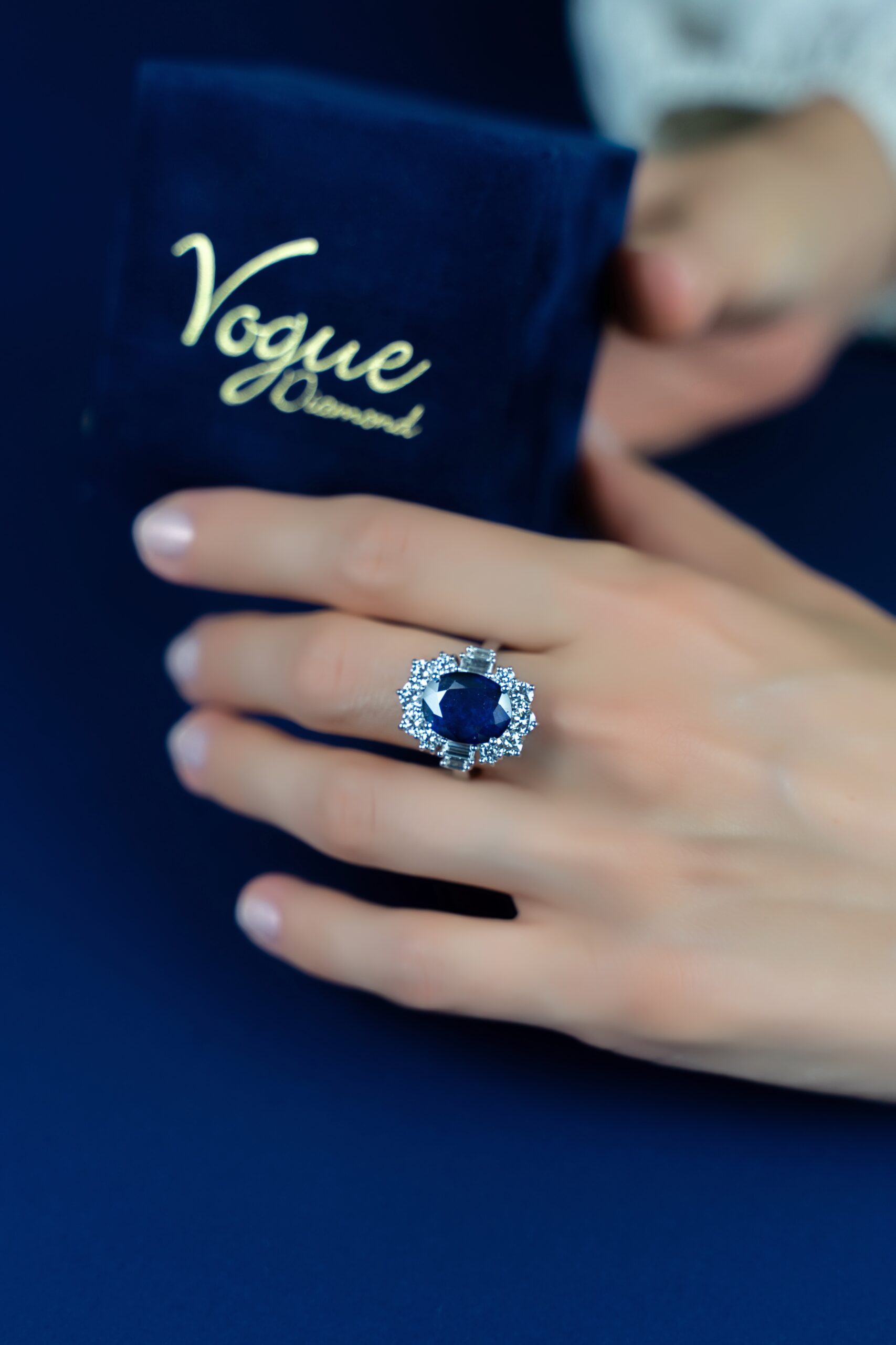 A captivating piece designed for those who appreciate fine jewelry, this ring showcases a large sapphire gemstone framed by shimmering diamonds. Its classic yet striking appearance makes it perfect for making any moment memorable.