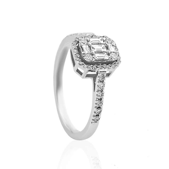 Handcrafted in 18ct white gold, the ring features a 0.44ct round brilliant cut and baguette cut diamonds.