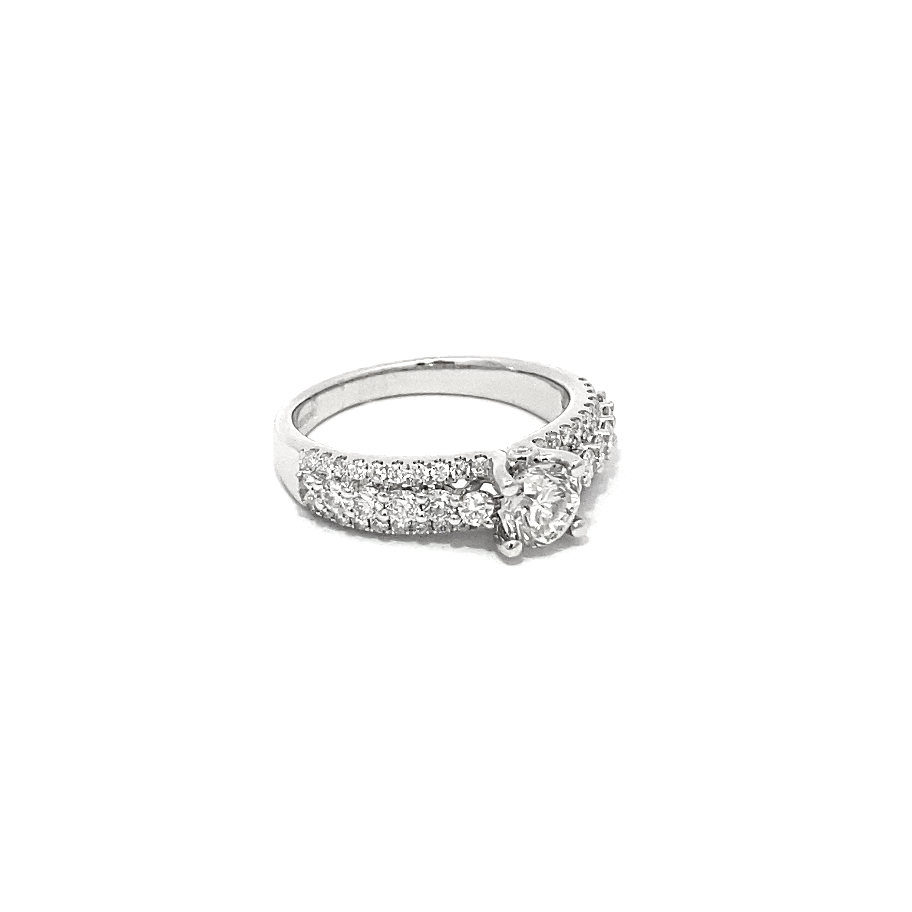 This stunning diamond ring features a brilliant solitaire stone set in a band adorned with smaller sparkling diamonds. Perfect for engagements or special occasions, this elegant piece exudes sophistication and timeless beauty.