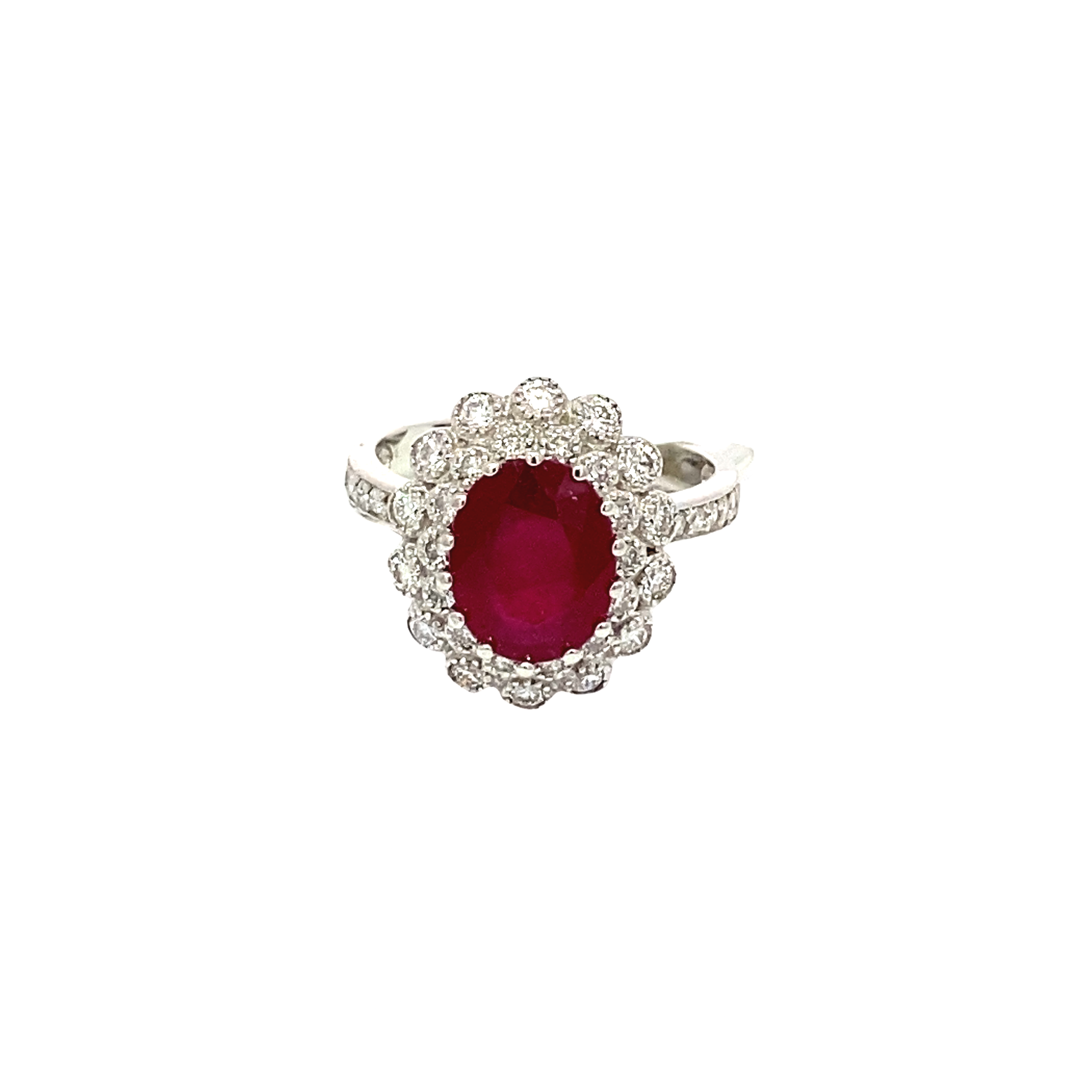 This stunning ring showcases a vibrant ruby surrounded by a halo of sparkling diamonds. Perfect for any special occasion, its timeless elegance and sophisticated design make it an exquisite addition to any jewelry collection.