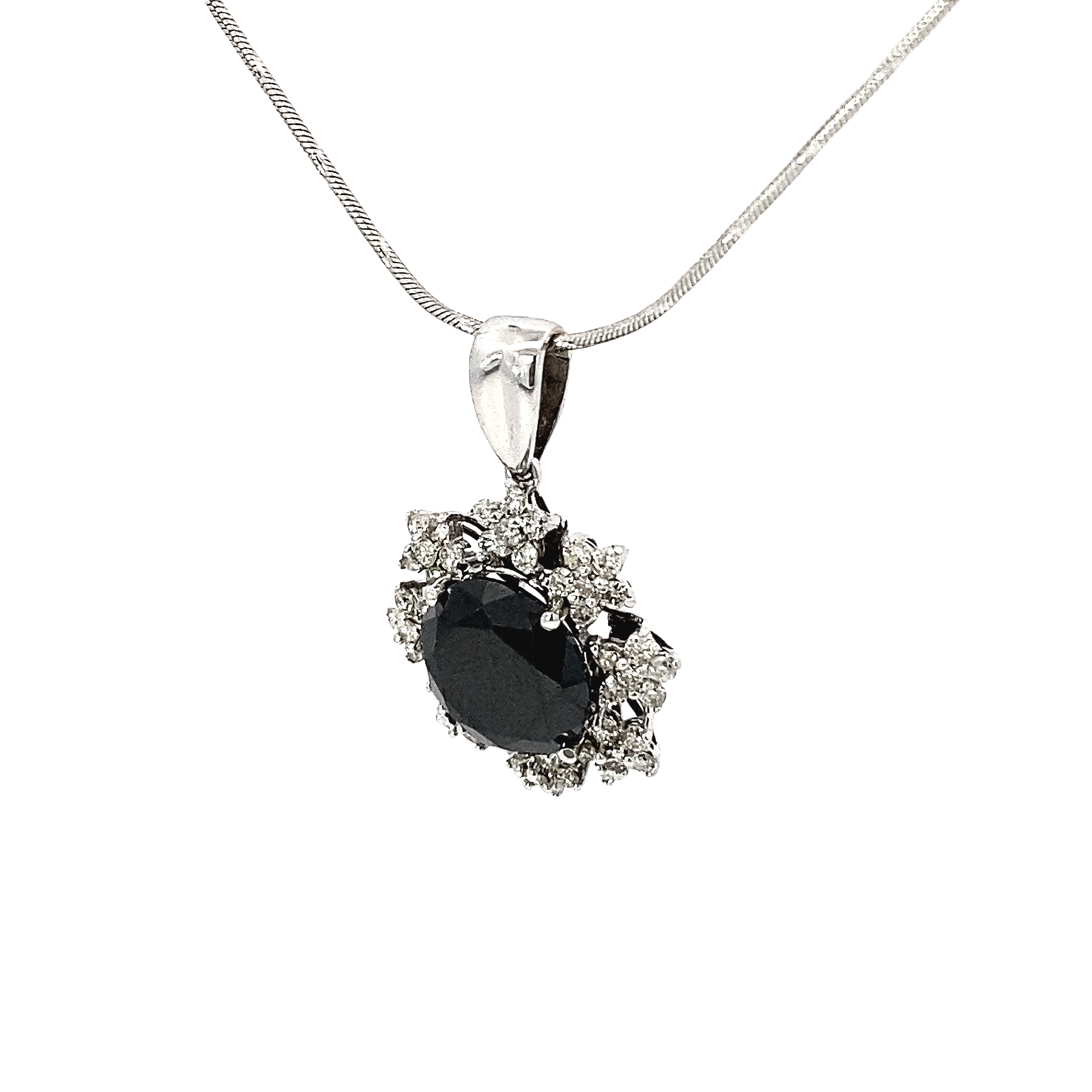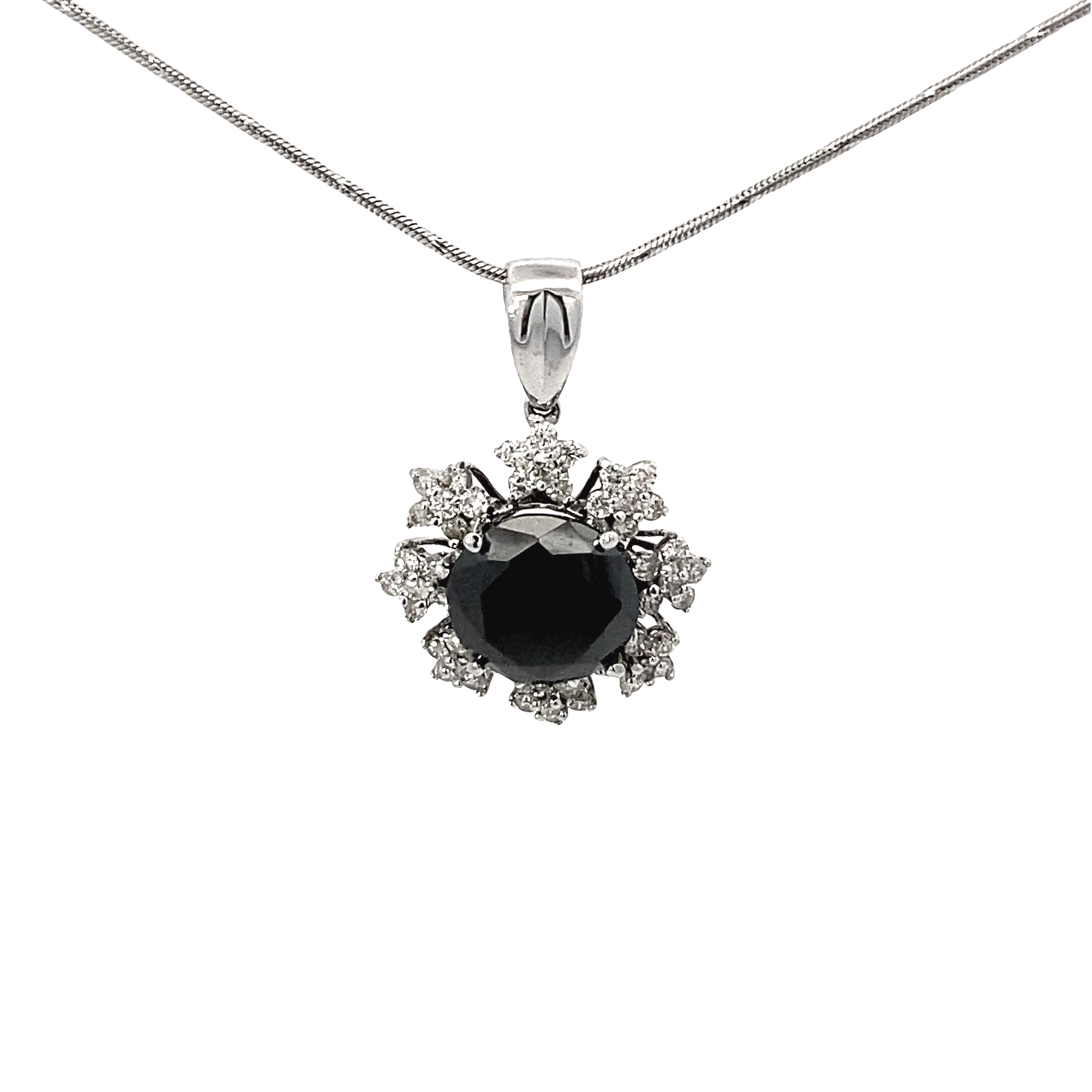 Elevate your style with this beautiful pendant featuring a striking black gemstone at its center. Surrounded by shimmering white diamonds and suspended from a refined gold chain, this piece is the epitome of grace and sophistication.