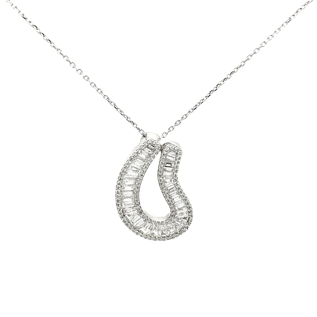 Make a statement of grace and luxury with this dazzling diamond pendant necklace. The intricate horseshoe-shaped pendant is encrusted with brilliant diamonds, elegantly suspended from a fine chain. A perfect accessory for timeless beauty.