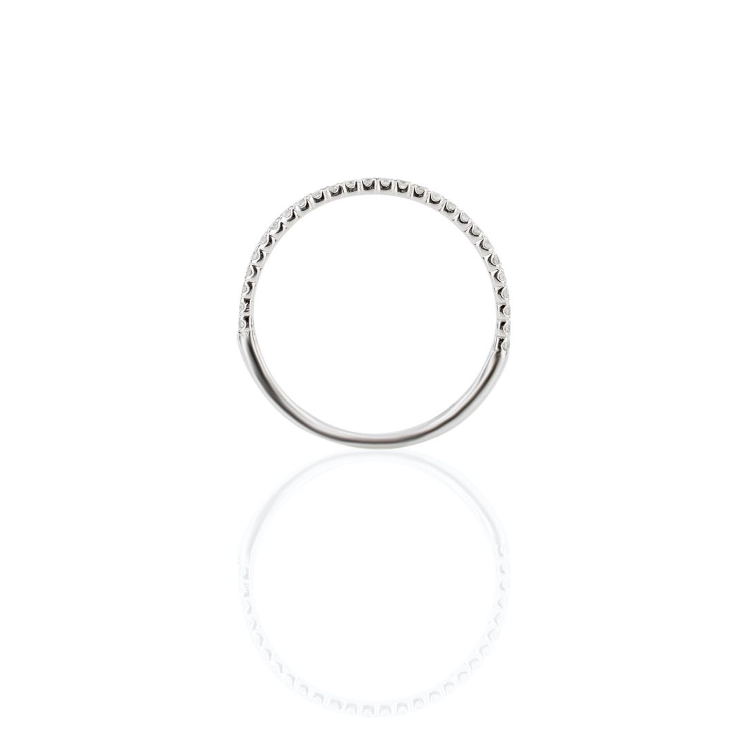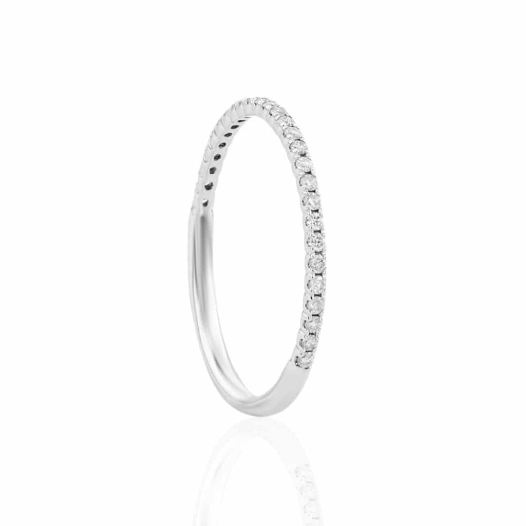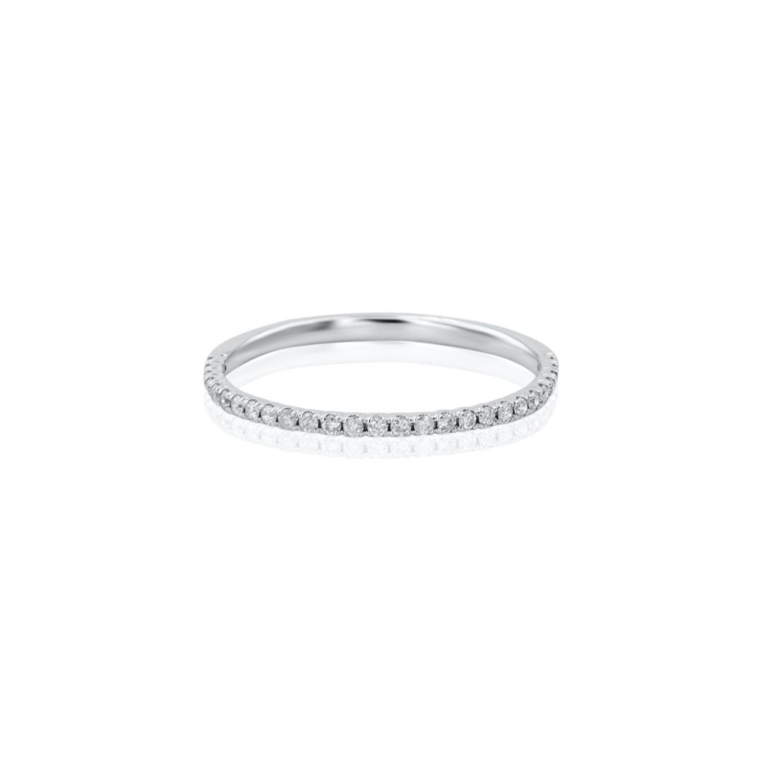 A modern and timeless traditional symbol of commitment, half pave wedding ring with 0.17 ct round brilliant cut diamonds. Crafted in 18ct white gold. Available in also in 14ct gold, platinum and paladium.